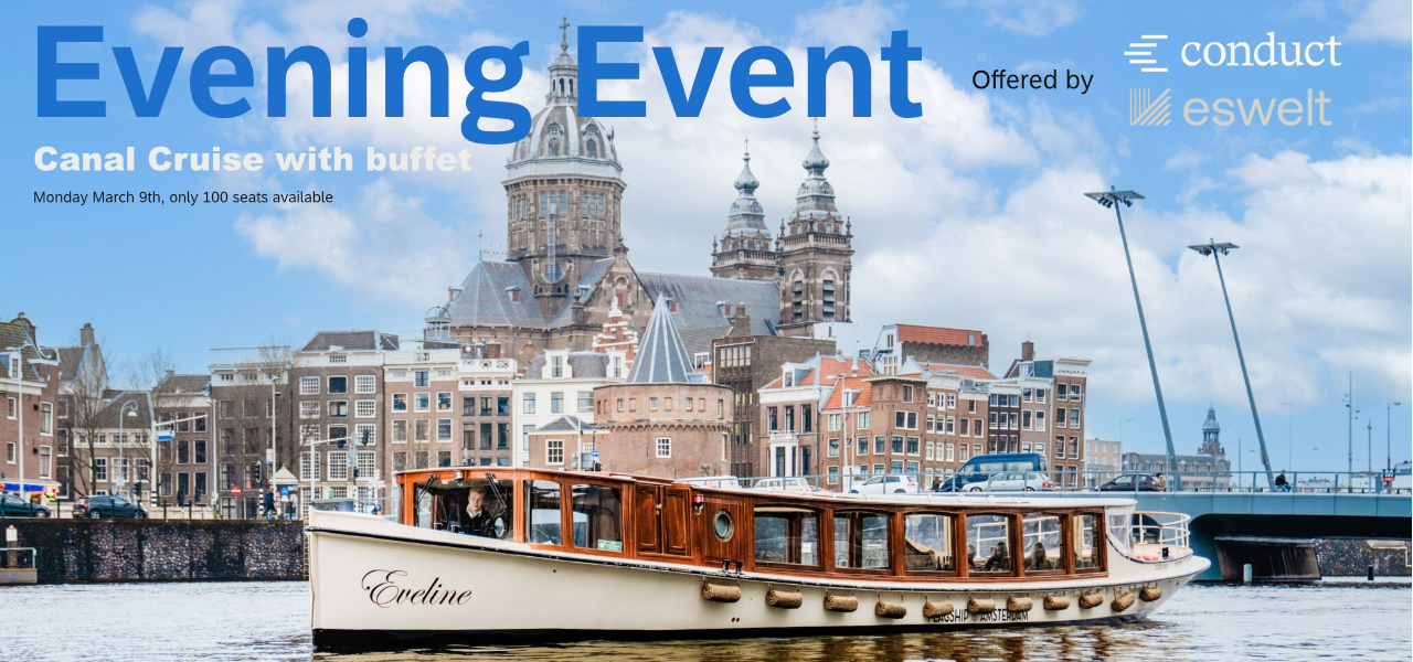 We’re also excited to announce a special evening event sponsored by Eswelt and Conduct! As part of our event, you’ll have the chance to join an unforgettable canal cruise with a buffet through the beautiful waterways of Amsterdam. This is a unique opportunity to relax, connect, and enjoy great food while taking in the city’s iconic canals.